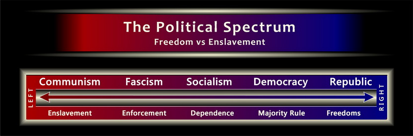 The political spectrum is not a scale between two oppressive political systems, but spans a very wide spectrum between enslavement and freedom. By expanding the spectrum further to the right toward freedom, the new political spectrum now includes a position for Democracy which attempts to bring equality, and a Republic which guarantees the natural freedoms and rights of each individual.